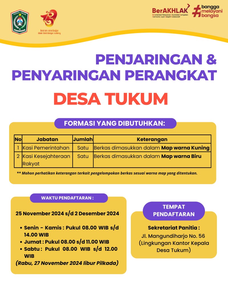 Tukum, KIM - Ketua Panitia Penjaringan dan Penyaringan Perangkat Desa Tukum, Joko Sri Mardiyanto, mengungkapkan bahwa proses seleksi pengisian formasi lowongan perangkat desa akan ...